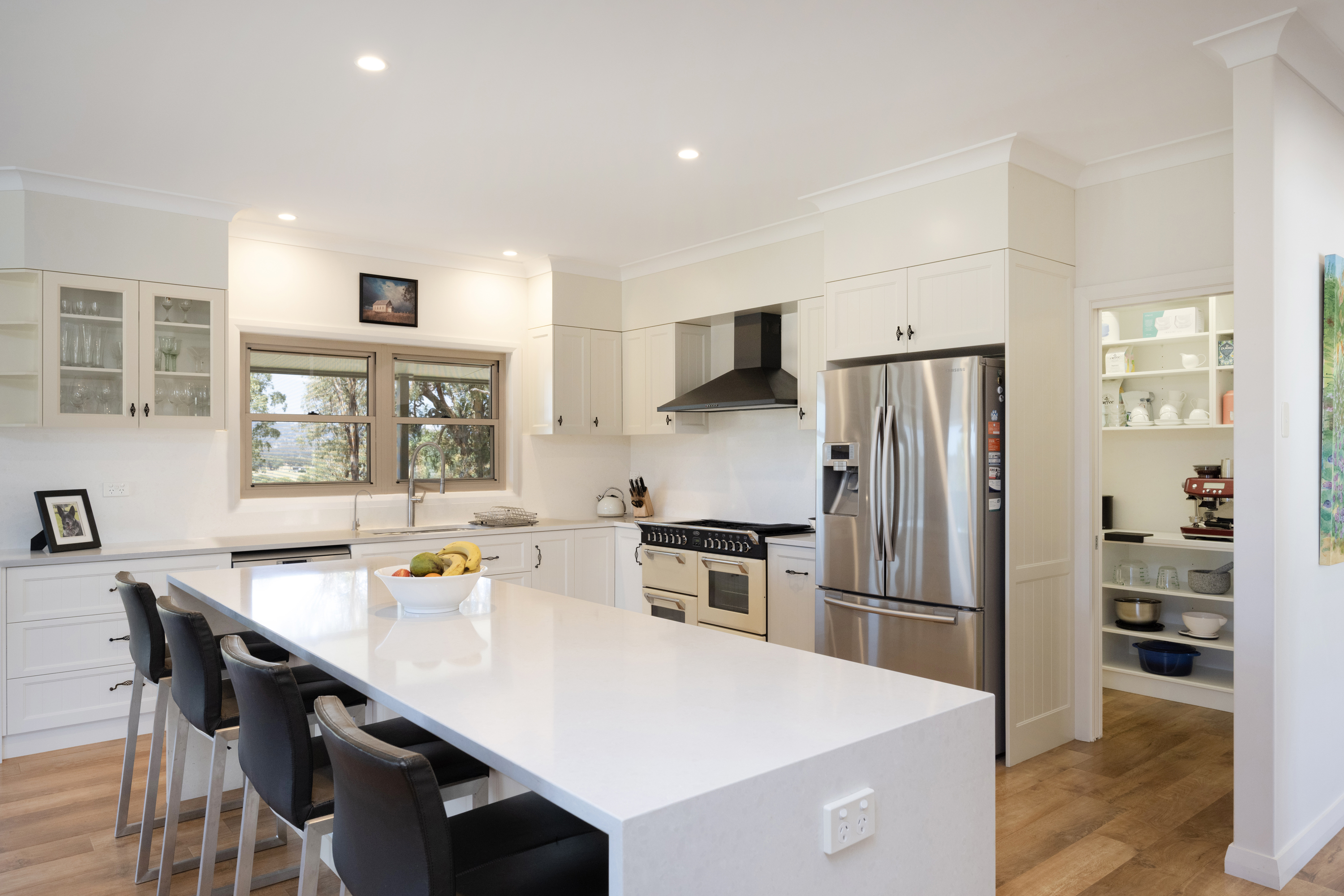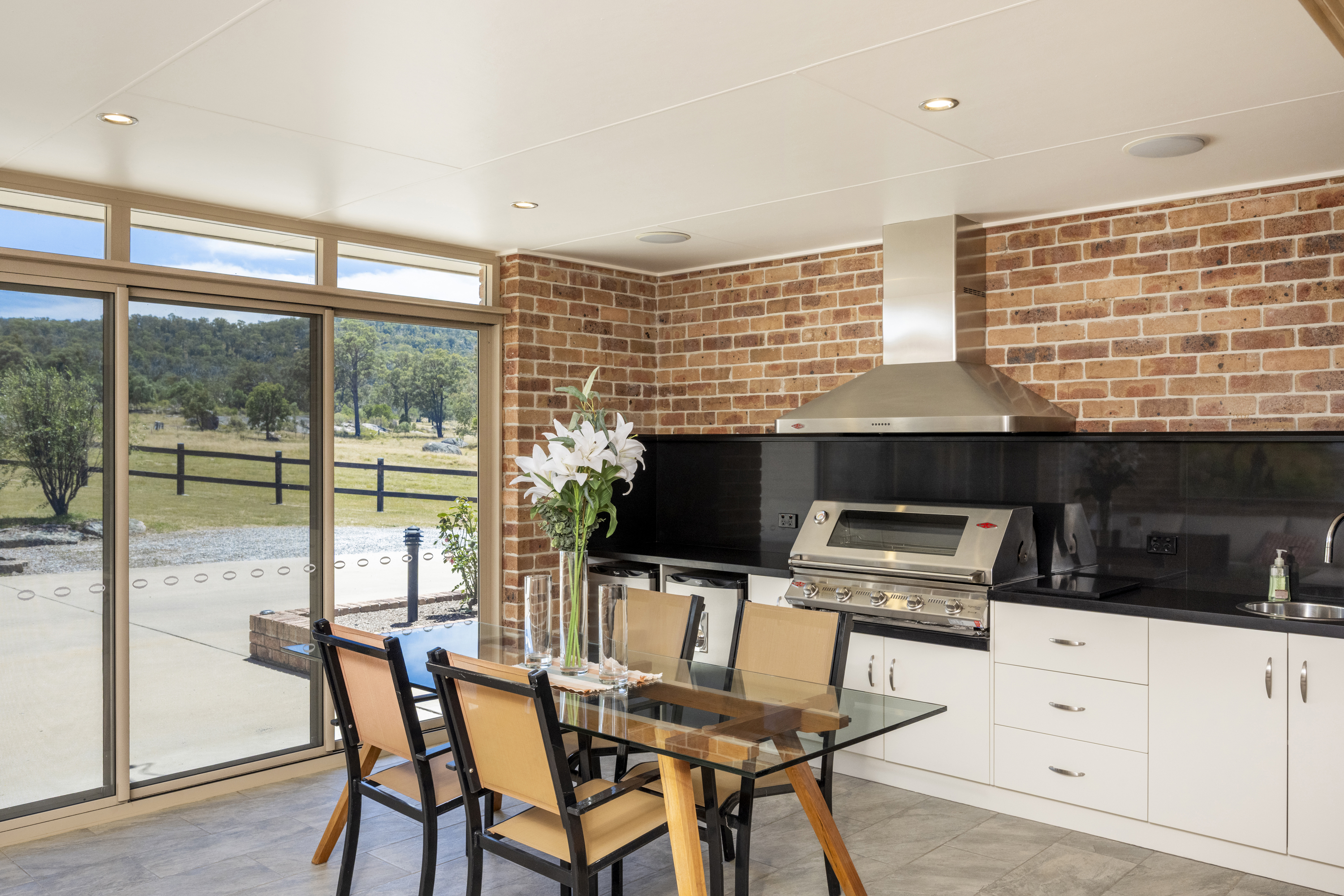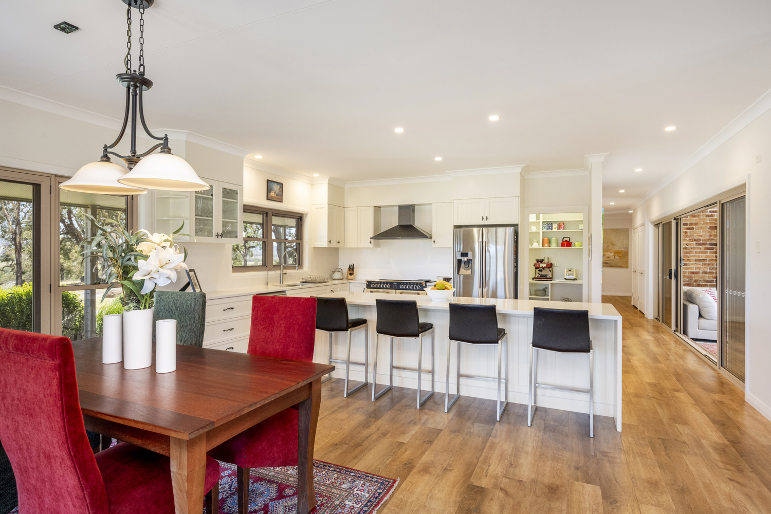 The premium 3-bedroom, 2-bathroom residence captures stunning views on all sides. The master suite occupies a private wing and includes a massive fully-tiled ensuite with bath, a dressing room and study. The gourmet kitchen showcases a Belling free-standing range, butler's pantry, and Caesarstone benches. Entertainment features include an indoor-outdoor area with Caesarstone benches and built-in barbeque, balcony dining with breathtaking views, and a theatre system in the main living area. Climate control is provided by 2 split systems and a wood burner. Crimsafe screens protect all openings, and a 2-car semi-detached garage completes the residence.