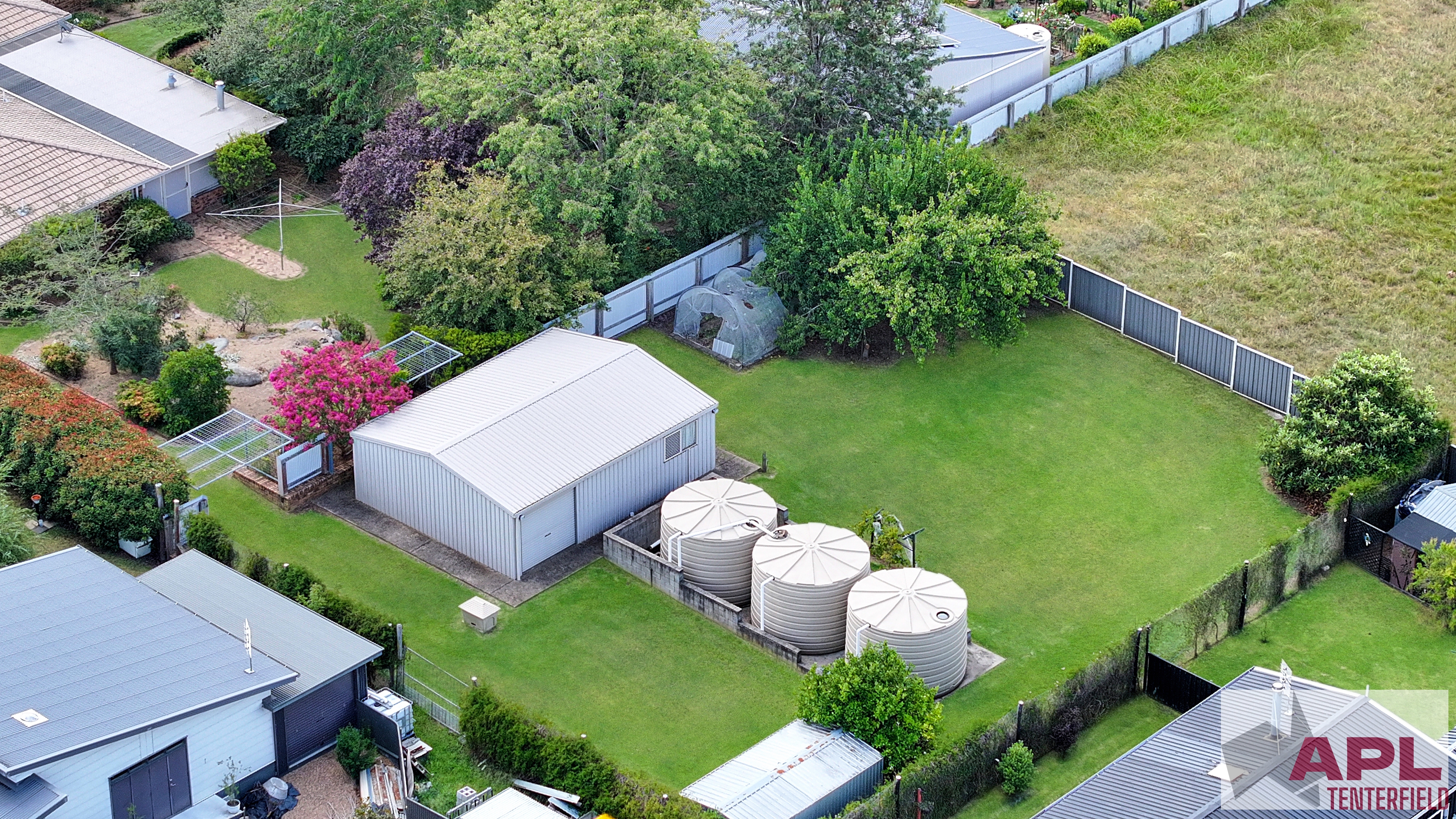 Additional features include a 9m x 7m shed/workshop, garden and woodsheds, three 5,000-gallon rainwater tanks, and a bore, ensuring excellent water supply and storage options.